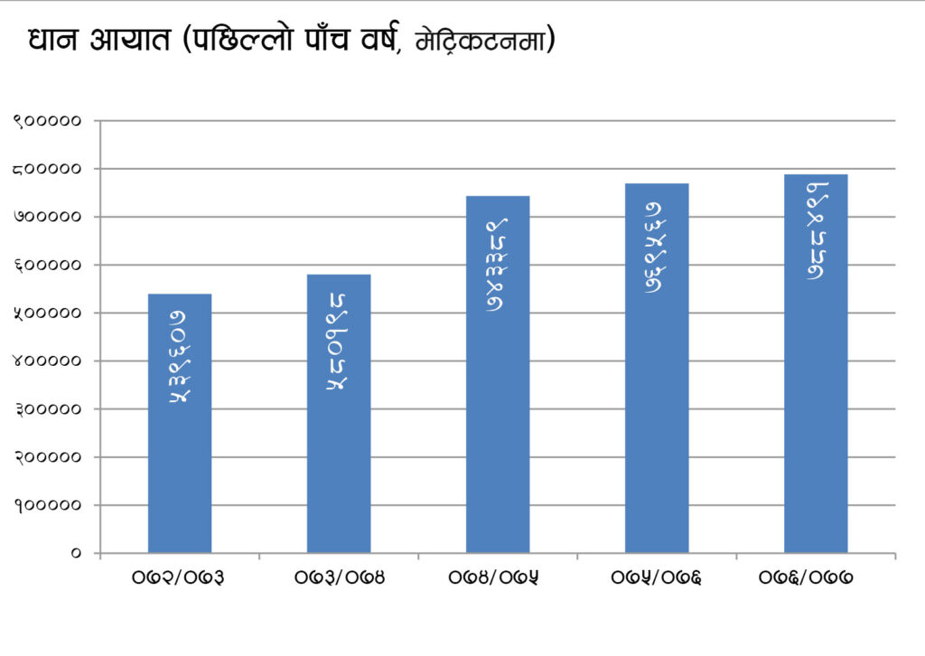 त्यो समय देख्ने मानिस अझै जिउँदै छन्। नेपालले धान–चामल निर्यात गरेको देखेका मानिसहरूले अहिले ठिक उल्टो ग्राफ हेर्नु परिरहेको छ। अहिले नेपालले निर्यात गर्नुको सट्टा निक्कै ठुलो परिमाणमा धान–चामल आयात गर्न थालेको छ। अझै आयातको ग्राफ घट्नुको सट्टा डरलाग्दो तरिकाले बढ्दो क्रममा उक्लिँदै गइरहेको छ।