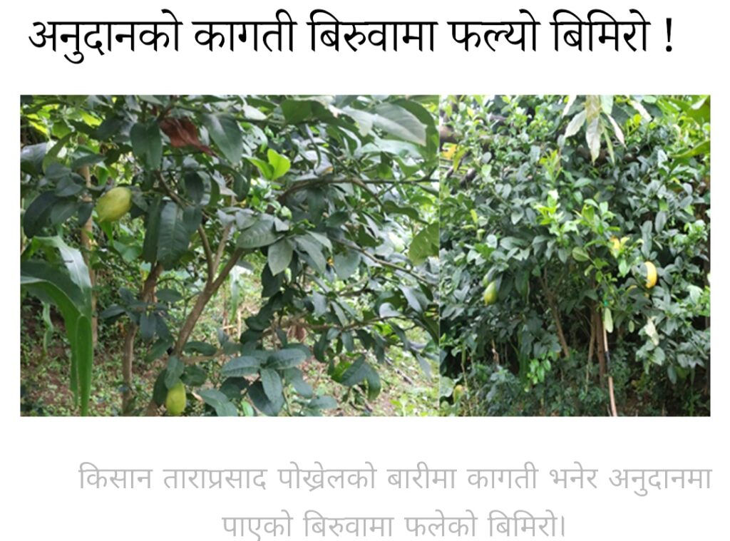 आर्थिक वर्ष २०७६/०७७ मा वडाले किसानलाई बाँडेका बिरुवामा अहिले फल लागेको हो। कागती भनेर स्याहार गरी हुर्काएका बिरुवामा बिमिरो फलेपछि किसान खिन्न भएका छन्। स्थानीय किसान ताराप्रसाद पोख्रेलले उन्नत जातको सुनकागती भनेर वडाबाट अनुदान ल्याएका बिरुवामा बिमिरो फल्दा आश्चर्यचकित भएको बताए। ‘राम्रो जातको कागती भनेर वडाबाट १० बिरुवा अनुदानमा पाएँ, थप २० बिरुवा त्यही नर्सरीबाट आफैं किनेर ल्याएको थिएँ,’ उनले भने, ‘तर, अहिले चिचिला लाग्दा त बिमिरो पो फल्यो।’