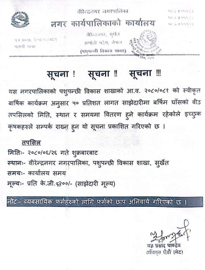 वीरेन्द्रनगर नगरपालिकाको पशुपन्छी विकास शाखावाट पशुपालक कृषकहरुलाई बितरण गरेको बर्सिम घासको बीउमा व्यापक अनियमितता भएको पाइएको छ । घासको बीउ बजारको चलनचल्ति मुल्य भन्दा १ सय रुपैया बढीमा बितरण गरेको पाईएको हो ।