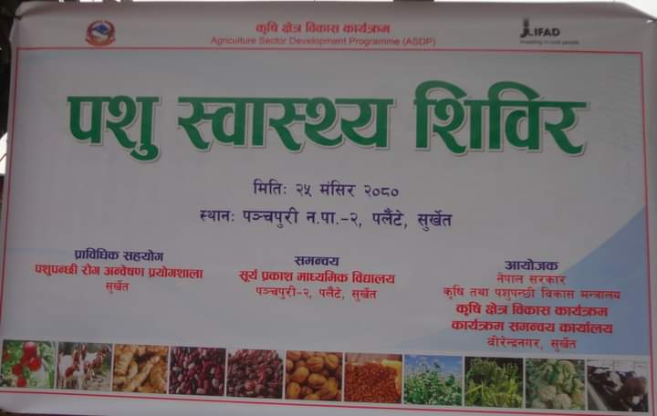 सुर्खेतको पञ्चपुरी नगरपालिका-२, को पलैटेमा पशु स्वास्थ्य शिविर सम्पन्न भएको छ । सोमबार कृषि क्षेत्र विकास कार्यक्रम अन्तर्गतको कार्यक्रम समन्वय कार्यालय सुर्खेतको आयोजना, पशुपन्छी रोग अन्वेषण प्रयोगशालाको प्राविधि सहयोग र सूर्य प्रकाश माध्यमिक विद्यालयको समन्वयमा शिविरको आयोजन गरिएको हो ।