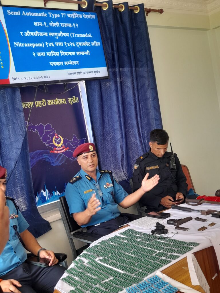 सुर्खेत । सुर्खेतमा पछिल्लो समय अपराध अनुसन्धान नियन्त्रणका लागि अप्रेसनका रुपमा सक्रियता देखाई रहेको जिल्ला प्रहरी कार्यालयलाई अर्को सफलता हात लागेको छ । गत हप्ता मात्रै ठूलो परिमाणमा अफिम र नक्कली नोटमा संलग्न गिरोहलाई पक्राउ गरेको सुर्खेत प्रहरीले साउन १ गते वीरेन्द्रनगर-८ कृष्ण मन्दिर स्थित एक घरबाट सेमि अटोमेटिक चाइनिज पेस्तोल, घरेलु हतियार र औषधिजन्य लागुऔषध सहित २ जनालाई नियन्त्रणमा लिएको छ ।