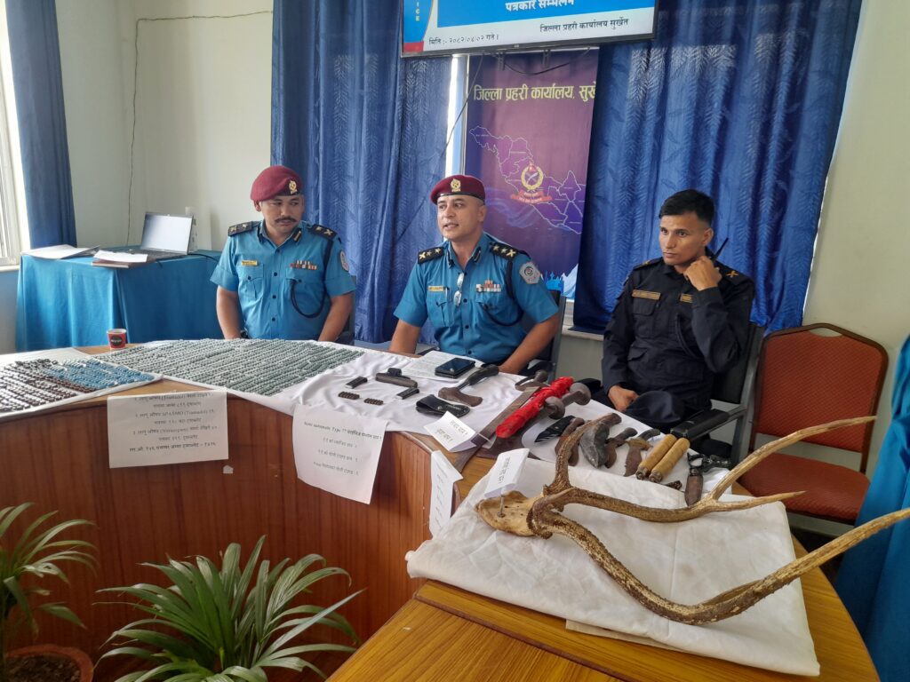 त्यस्तै, कोठाबाट प्रतिबन्धित वन्यजन्तु जरायोको जस्तो देखिने ओखेटोपहार (सिङ) १ थान समेत बरामद गरिएको जिल्ला प्रहरी कार्यालयका प्रवक्ता एवं डीएसपी मोहनजंग बुढाथापाले जानकारी दिए । सुर्खेत प्रहरीले अपराध नियन्त्रणका लागि यसलाई महत्त्वपूर्ण सफलतका रूपमा व्याख्या गरेको छ ।