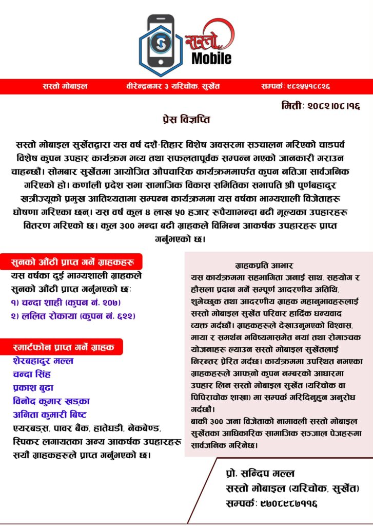 सस्तो मोवाइलले चाडपर्वमा लक्षित गरेर आफ्ना ग्राहकहरुलाई वितरण गरिरहेका कुपनहरूमध्ये भाग्यशाली ३०० भन्दा बढी ग्राहकहरूले आकर्षक उपहार प्राप्त गरेको सस्तो मोबाइलका सञ्चालक सन्दीप मल्लले जानकारी दिए। उनका अनुसार, यस वर्ष कुल ४ लाख ५० हजार रुपैयाँभन्दा बढी मूल्यका उपहारहरू ग्राहकलाई प्रदान गरिएको छ।