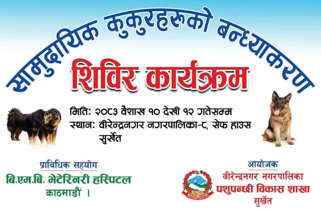 वीरेन्द्रनगर नगरपालिका–८ स्थित सेफ हाउसमा आगामी २०८३ साल वैशाख १० गतेदेखि १२ गतेसम्म उक्त शिविर आयोजना गरिने जनाइएको छ। कार्यक्रममार्फत सडक तथा सामुदायिक कुकुरहरूको संख्या व्यवस्थापन, रोग नियन्त्रण तथा मानव–कुकुर द्वन्द्व न्यूनीकरण गर्ने लक्ष्य राखिएको छ।